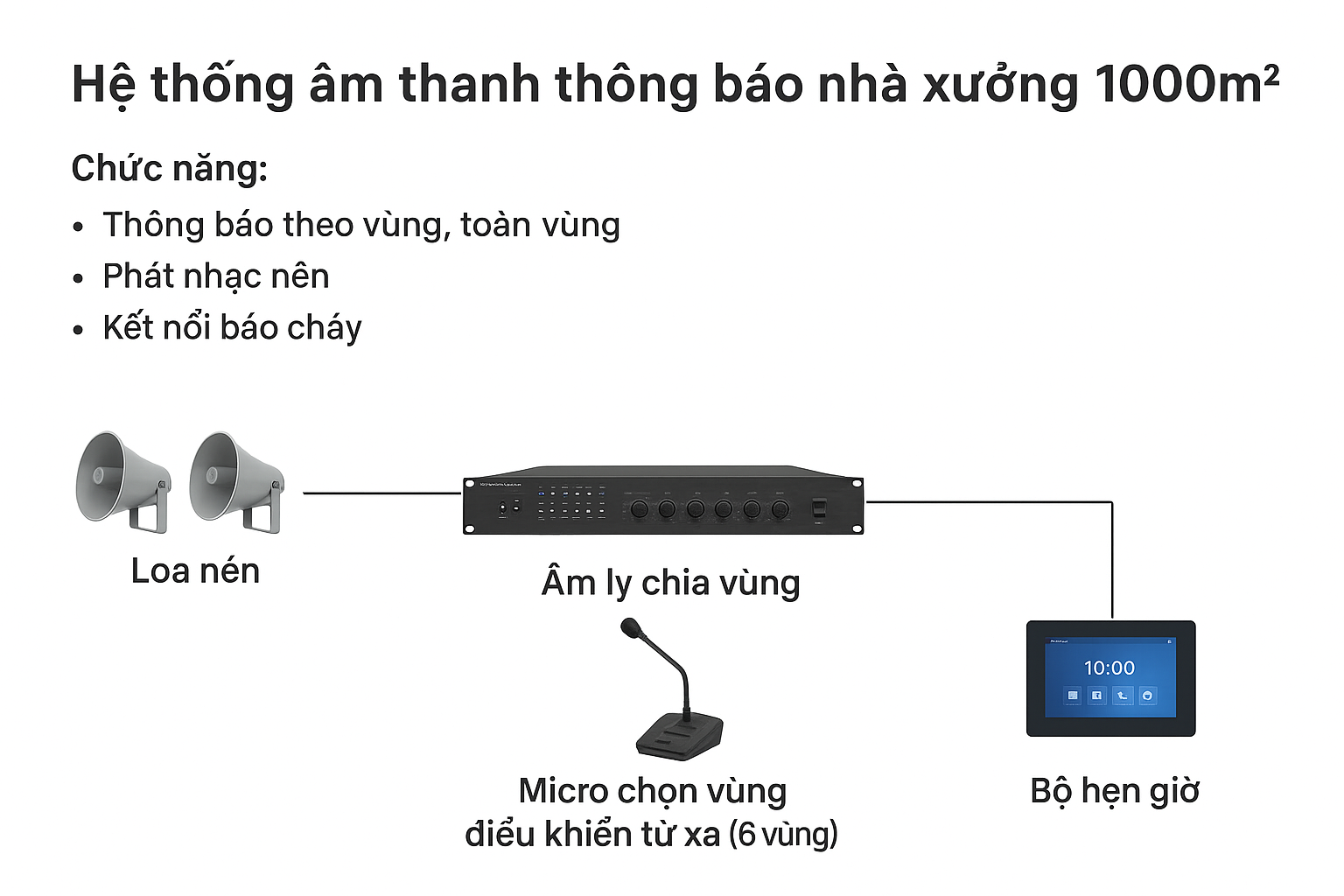 Giải pháp âm thanh thông báo cho nhà xưởng diện tích 1000m² được thiết kế nhằm đáp ứng nhu cầu: